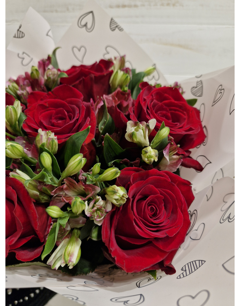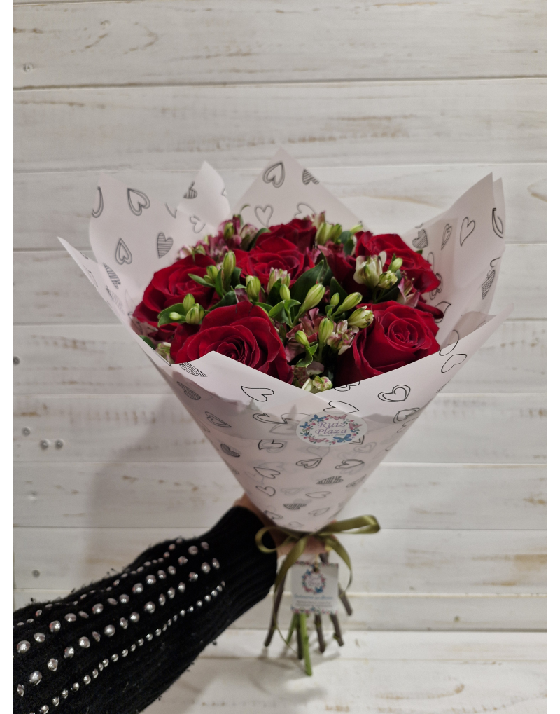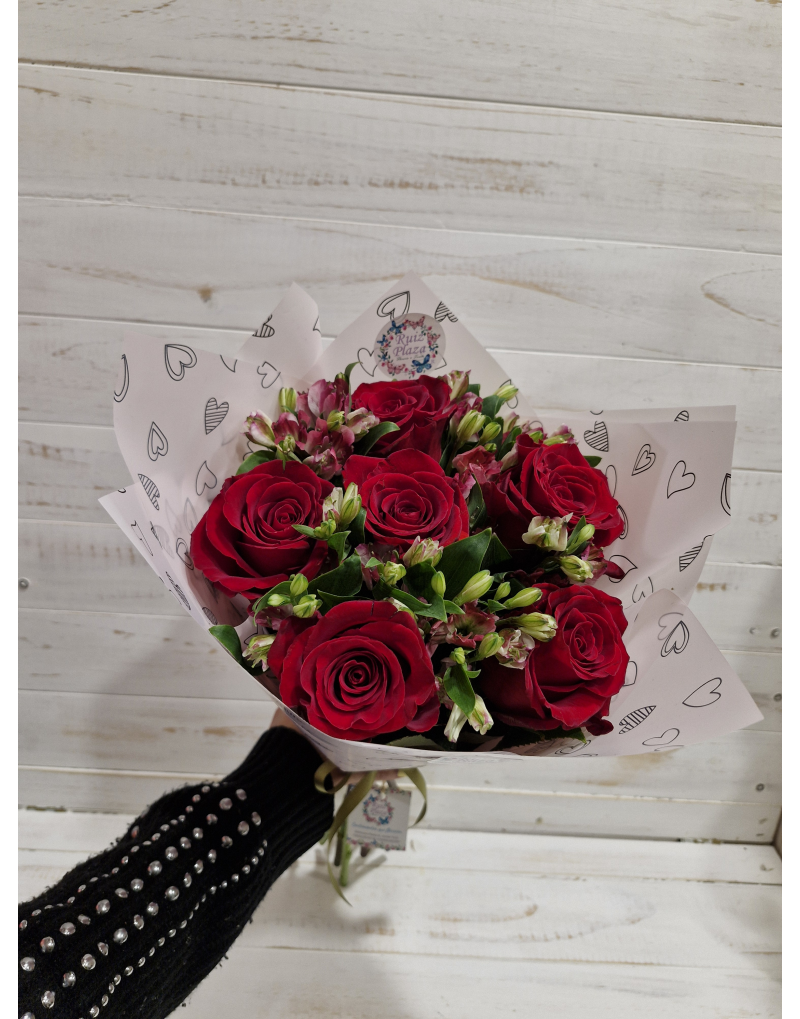 DELICADO RAMO DE FLORES COMPUESTO POR 6 ROSAS ROJAS IMPORTADAS, ACOMPAÑADAS DE 4 VARAS DE CHARMELIAS, ENVUELTAS EN PAPEL COREANO.